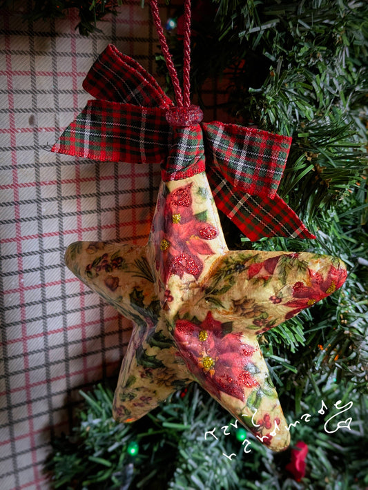 Stella di Natale “Winter Bloom” – Decorazione in decoupage con fiocco scozzese